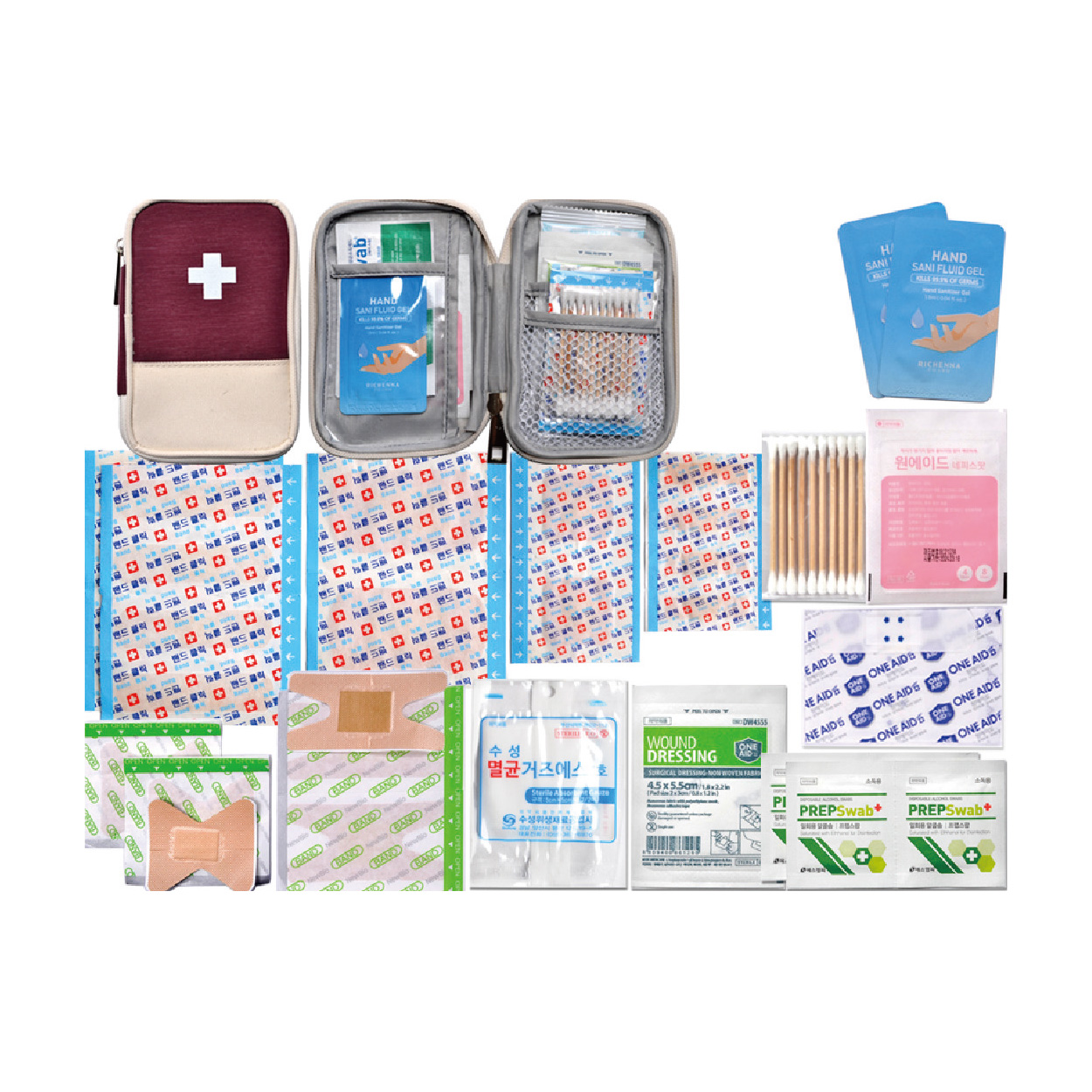 하이드로콜로이드밴드12P/표준밴드8p/대형밴드2p/사각밴드2p/ 미니밴드4p/손끝밴드2p/관절밴드2p/방수밴드2p/알콜솜4p/드레싱밴드/ 멸균거즈2p/손소독제2p/10p면봉/구급케이스 ※밴드이미지는 변경될수있음 / 종이케이스 포함