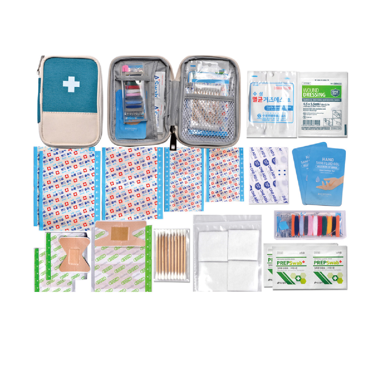 반짇고리세트(실,바늘,옷핀,귀이개,밴드,실끼우개)/표준밴드8p/대형밴드2p/ 사각밴드2p/미니밴드4p/손끝밴드2p/관절밴드2p/방수밴드2p/알콜솜4p/ 드레싱밴드/멸균거즈2p/손소독제2p/10p면봉/절솜4P/구급케이스 ※밴드이미지는 변경될수있음 / 종이케이스 포함