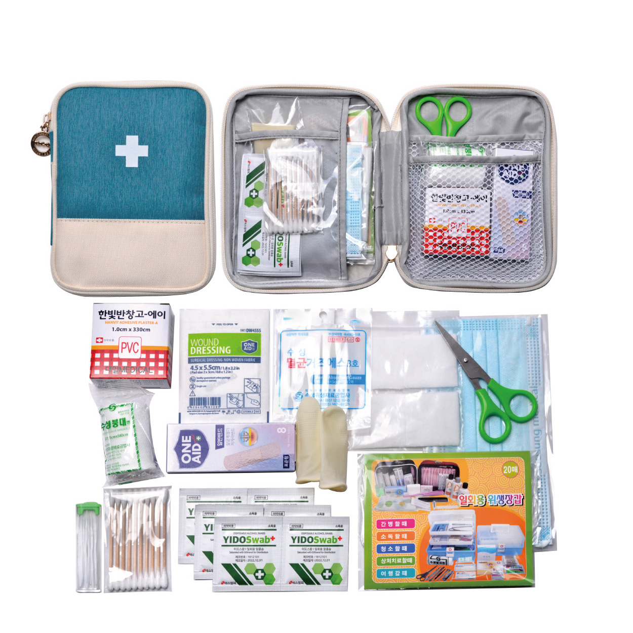 반창고/붕대소/밴드8P/지샤크2p/일회용마스크/가위/15p치간칫솔/ 알콜솜6p/드레싱밴드/멸균거즈2p/10p면봉/위생장갑/절솜4P/구급케이스 ※밴드이미지는 변경될수있음 / 종이케이스 포함