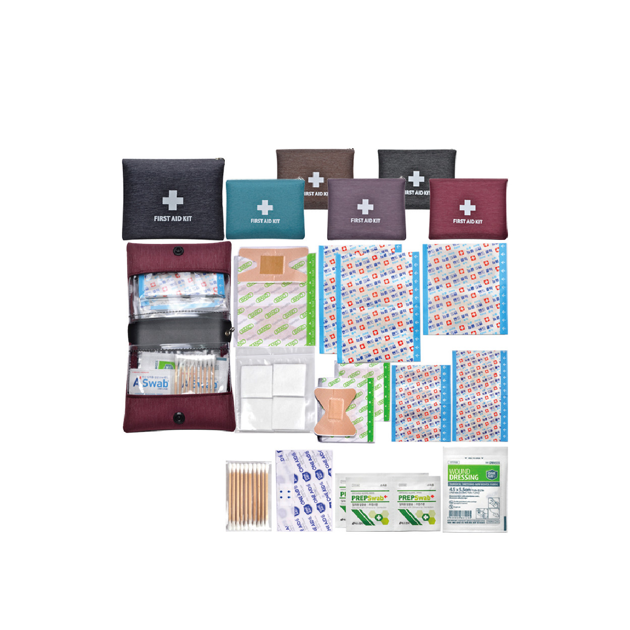 ※밴드이미지는 변경될수있음 / OPP포장포함 / 종이케이스비용은 별도 표준밴드8p/대형밴드2p/사각밴드2p/미니밴드4p/손끝밴드2p/관절밴드2p/ 방수밴드2p/알콜솜4p/드레싱밴드/10p면봉/절솜4P/구급케이스