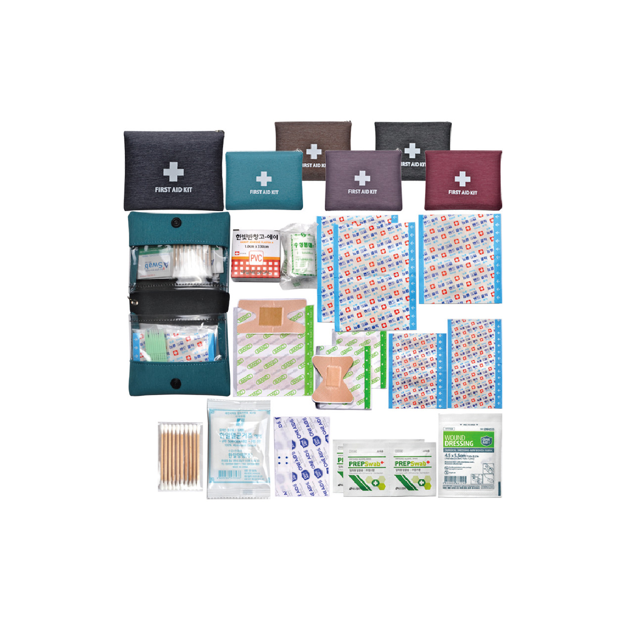 ※밴드이미지는 변경될수있음 / OPP포장포함 / 종이케이스비용은 별도 반창고/붕대소/표준밴드8p/대형밴드2p/사각밴드2p/미니밴드4p/ 손끝밴드2p/관절밴드2p/방수밴드2p/알콜솜4p/드레싱밴드/멸균거즈5p/ 10p면봉/구급케이스