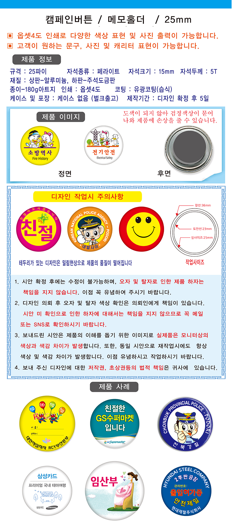 •1,000EA •기본수량 : 100EA •1,000개 이하 가격 별도 문의 •실사이즈:25mm / 도안선:23mm / 칼선:36mm •실사이즈:32mm / 도안선:30mm / 칼선:45mm 제품 상세 설명 / - 재질 : 철판 / 옵셋인쇄 (유광코팅) - 케이스 및 포장 : 케이스 없음 (벌크출고) - 제작기간 : 디자인 확정 후 5일