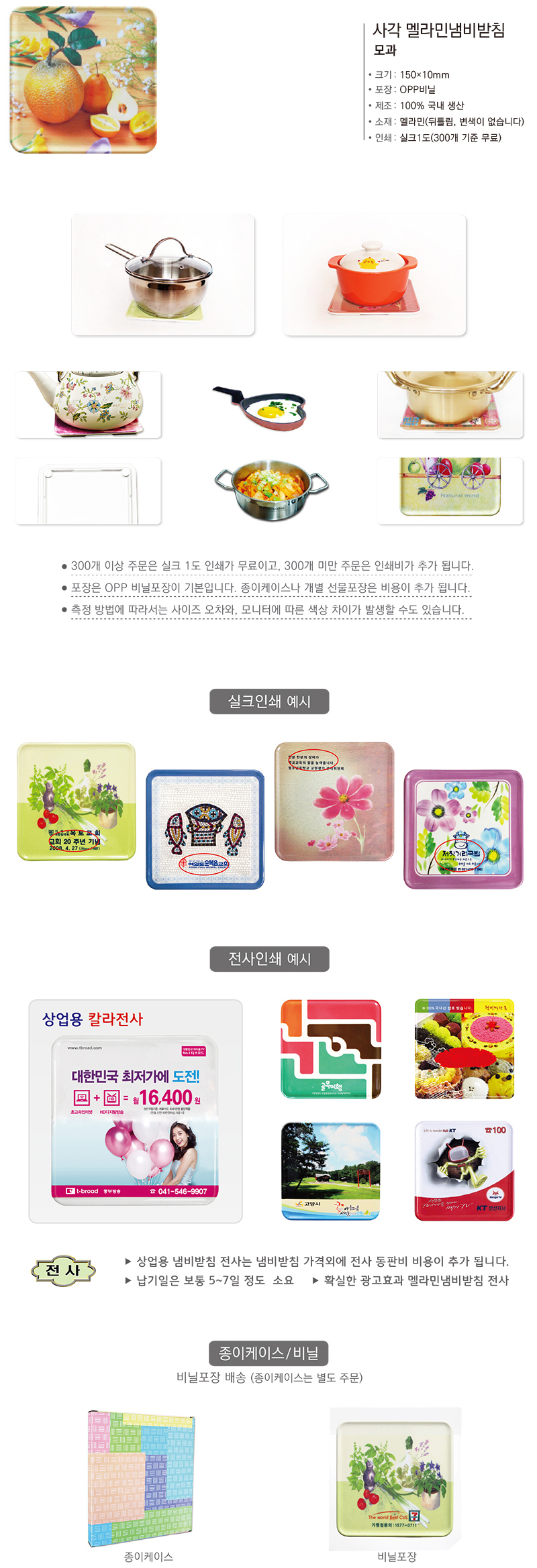•Size : 150×150mm ※ 기본 OPP포장 기준(종이케이스 포장시 50원 추가) ※ 멜라민 냄비받침