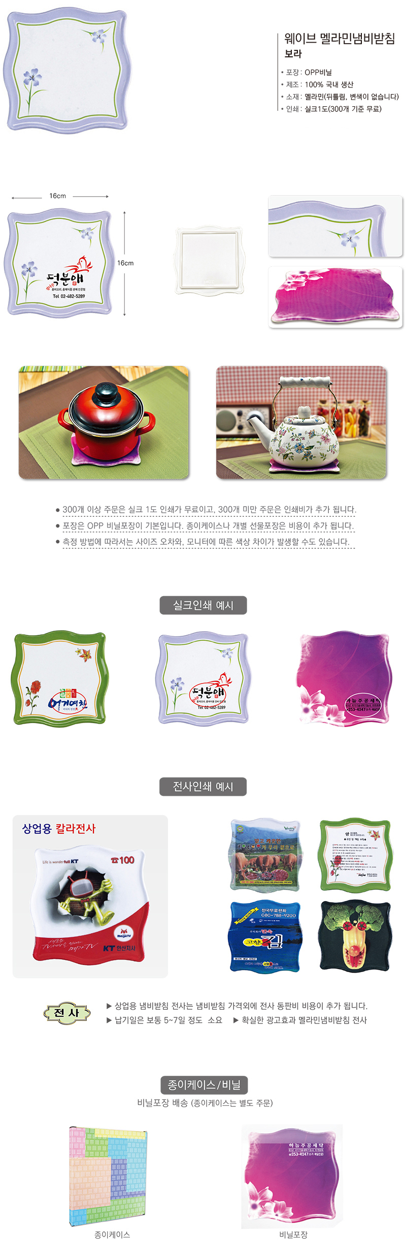 •Size : 160x160mm •멜라민냄비받침 100% 국내산 •300개 이상 주문, 1도인쇄 무료 ※ 기본 OPP포장 기준(종이케이스 포장시 50원 추가)