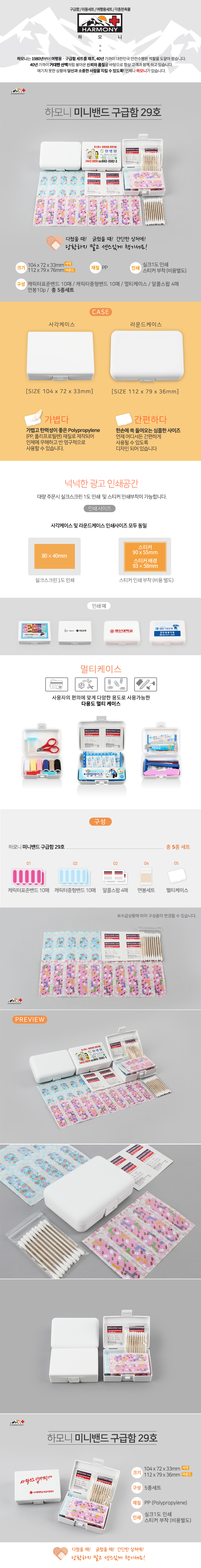 •SIZE : 104X72X33(mm) •종이케이스 200원 추가 •수량 : 400EA / 1박스 : 250개 •스티커 비용 별도 •캐릭터밴드 20매, 알콜스왑 4매, 면봉10p ※모든 내용물들은 수급상황에 따라 예고없이 변경될 수 있습니다.