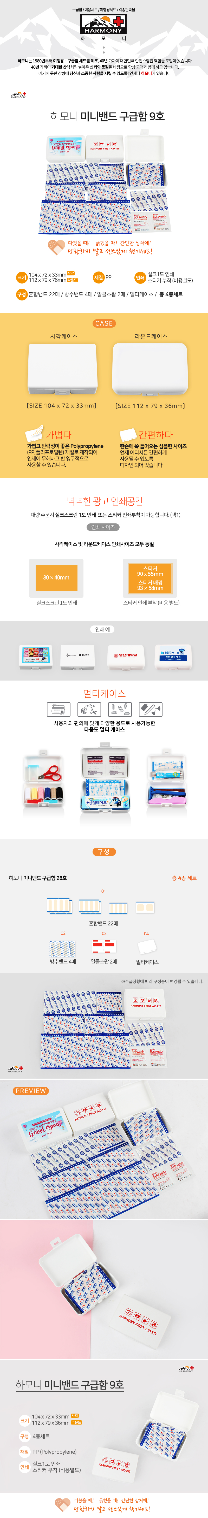 •SIZE : 104X72X33(mm) •종이케이스 200원 추가 •수량 : 400EA / 1박스 : 250개 •스티커 비용 별도 •혼합밴드 22매, 방수밴드 4매, 알콜스왑 2매,면봉세트 ※모든 내용물들은 수급상황에 따라 예고없이 변경될 수 있습니다.