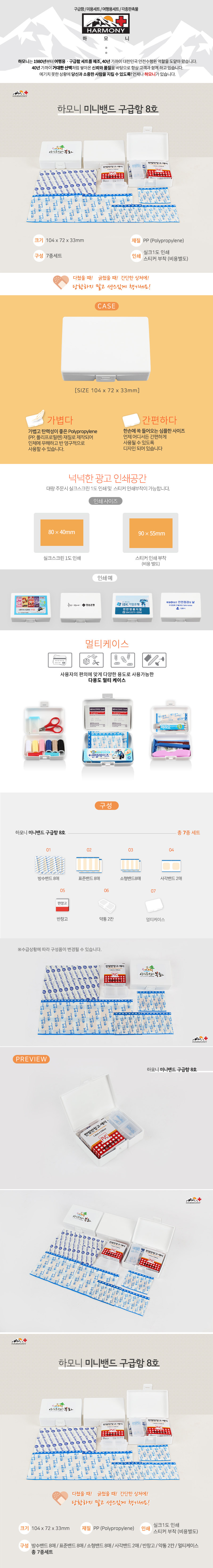 •SIZE : 104X72X33(mm) •종이케이스 200원 추가 •수량 : 400EA / 1박스 : 200개 •스티커 비용 별도 •혼합밴드 18매, 방수밴드 8매, 반창고, 2칸약통 ※모든 내용물들은 수급상황에 따라 예고없이 변경될 수 있습니다.
