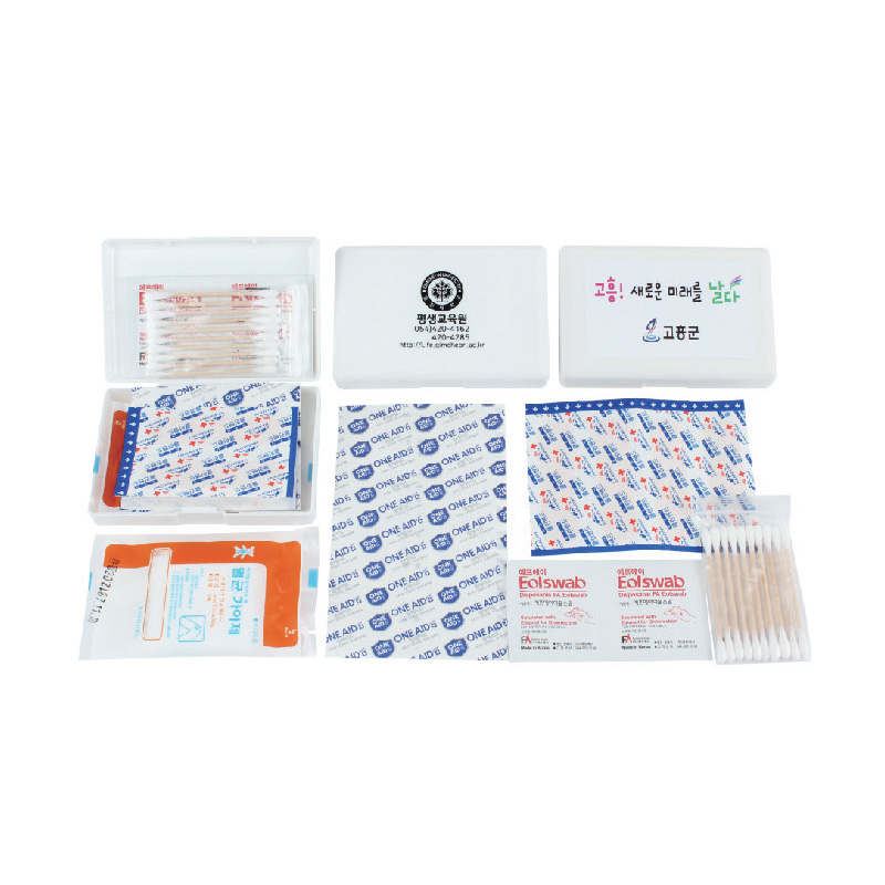 •SIZE : 115X75X22(mm) •수량 : 400EA / 1박스 : 250개 •스티커 비용 별도 •멸균거즈(5x5), 표준밴드 4매, 면봉, 방수밴드 4매, 알콜스왑 2매 ※모든 내용물들은 수급상황에 따라 예고없이 변경될 수 있습니다.
