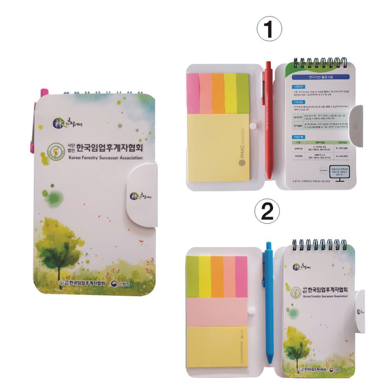 •겉표지, 스프링표지 : PP칼라인쇄(내지 100모조, 70매) •볼펜포함 •기본수량 : 1000부 •케이스Size:100×160×15mm •포스트잇:5색/20매