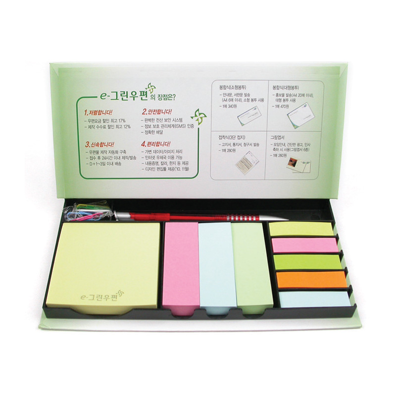 •케이스Size :220x120x22㎜ •점착메모지 70x76, 25x76㎜(3쪽) •형광오색(클립,볼펜포함)
