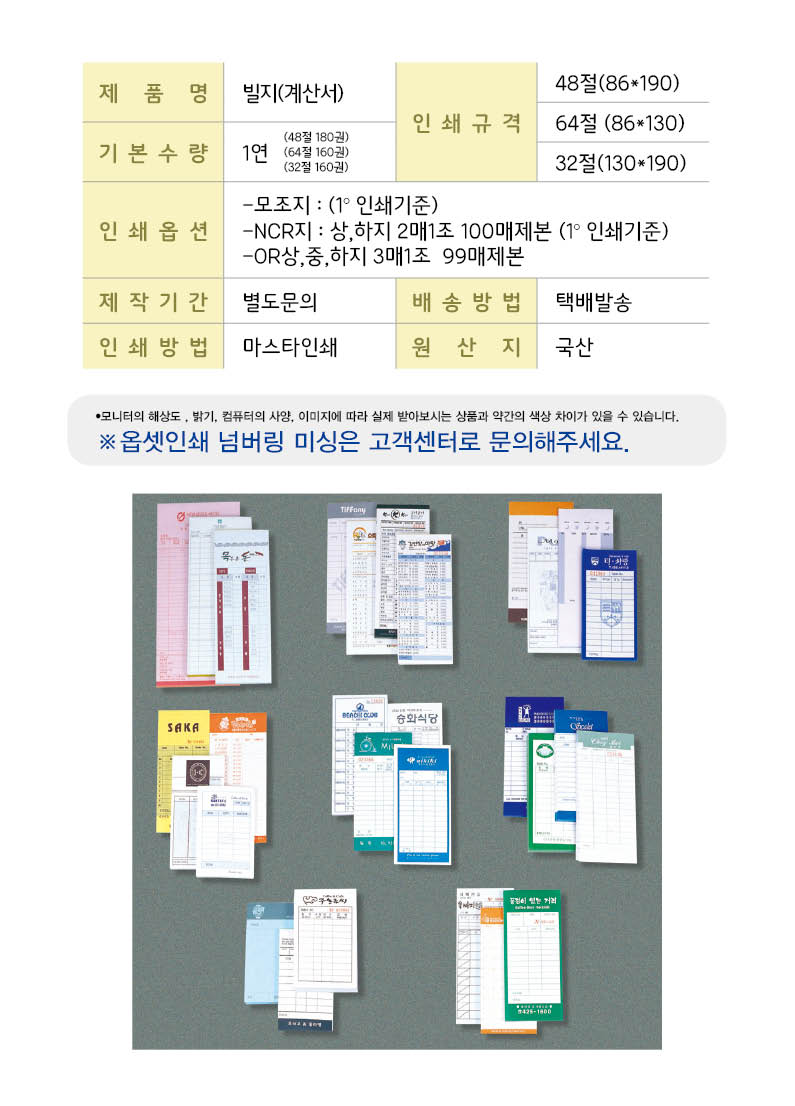 1 ~ 29 NCR(2조 1매)1° 인쇄기준 *64절(200권) 48절(180권) 32절(120권) -기본수량:1R •각종양식지문의 • 마스타인쇄기준가격/옵셋인쇄가능, 넘버링, 미싱은 별도작업