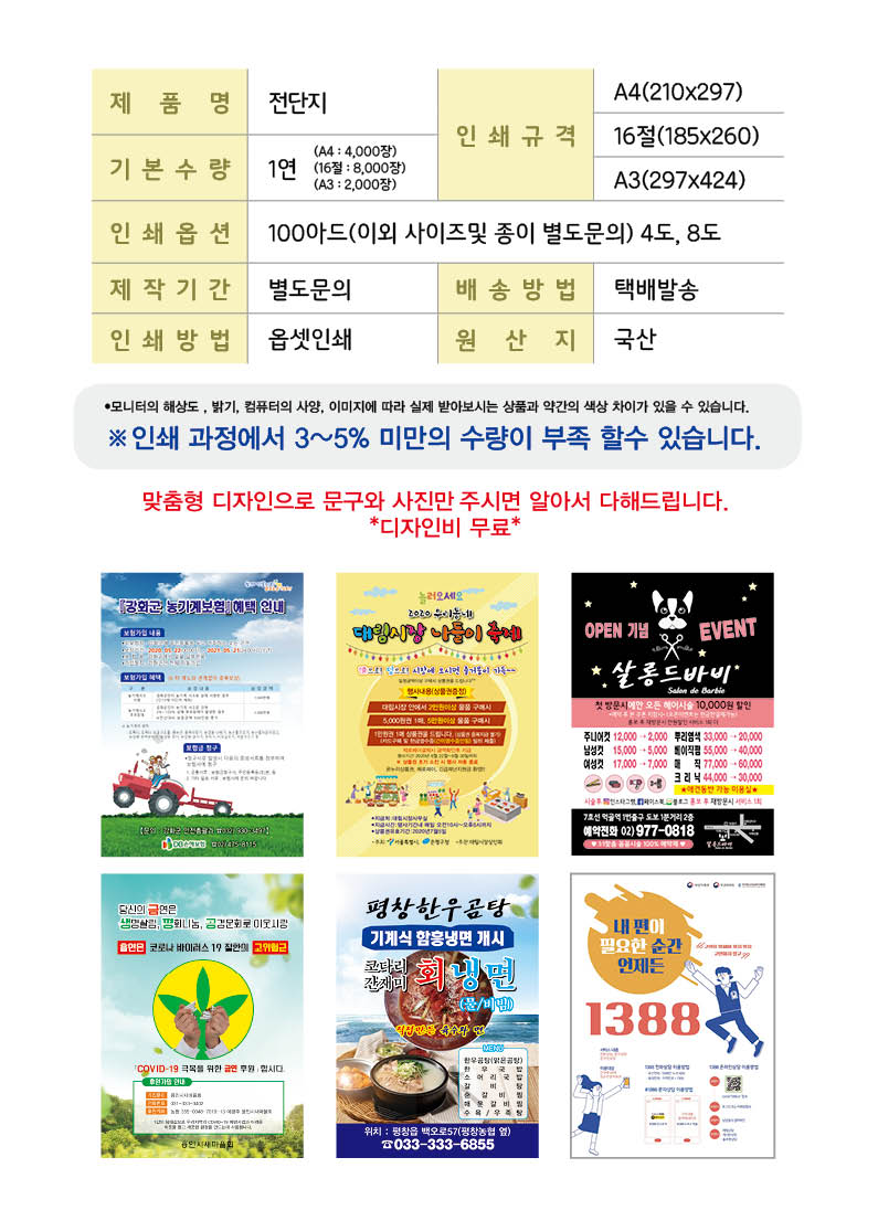 가격별도문의 •기본 1R(4,000매) •4도 ※옵셋4도 / 8도 ※이외 사이즈 별도문의